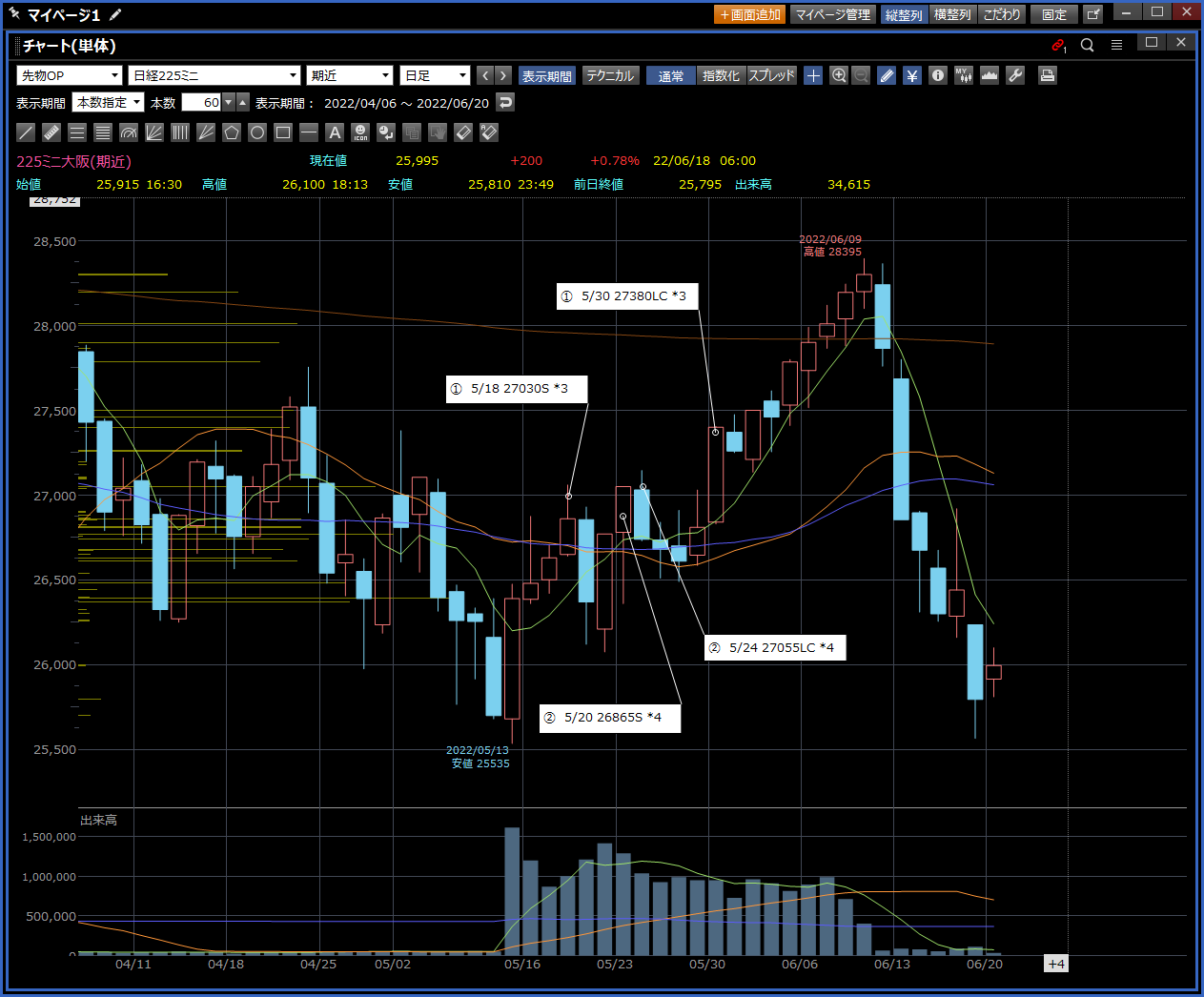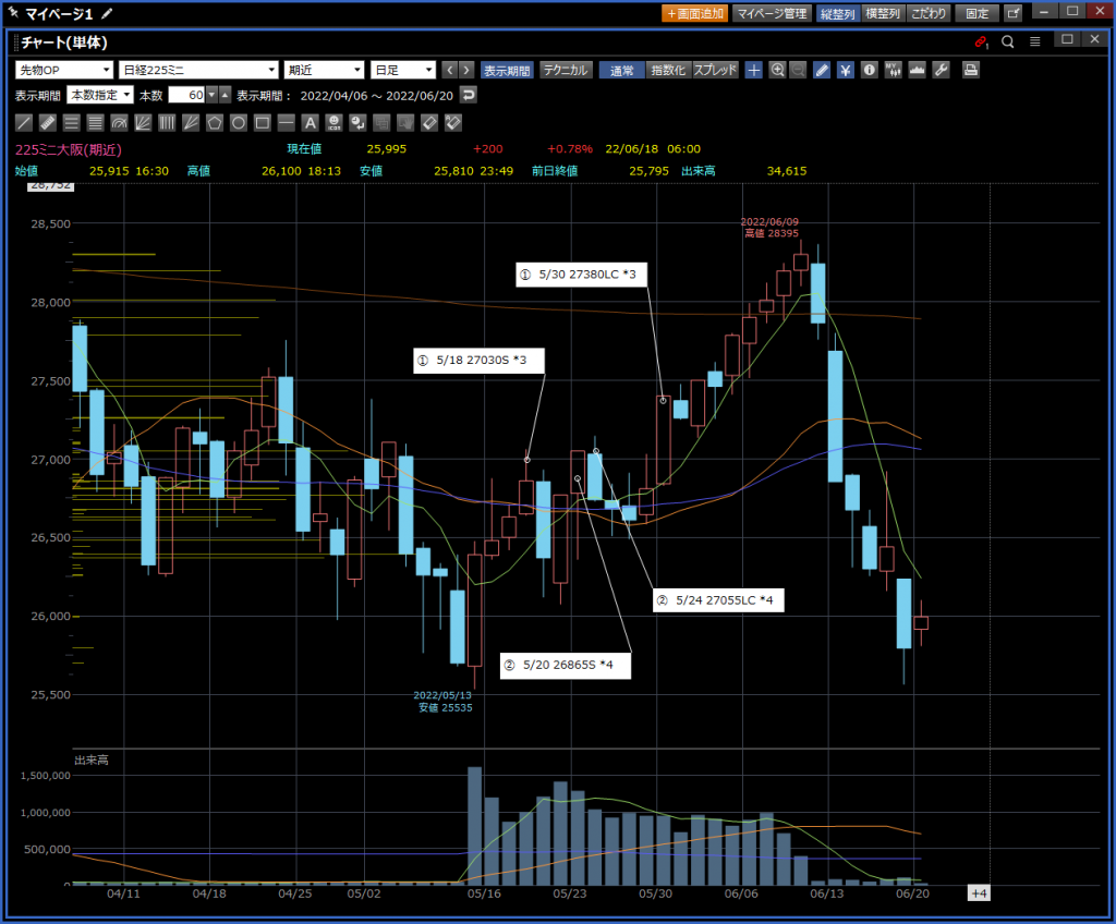 ポジションは2022/06先物ミニ 27030S*3と26865S*4。