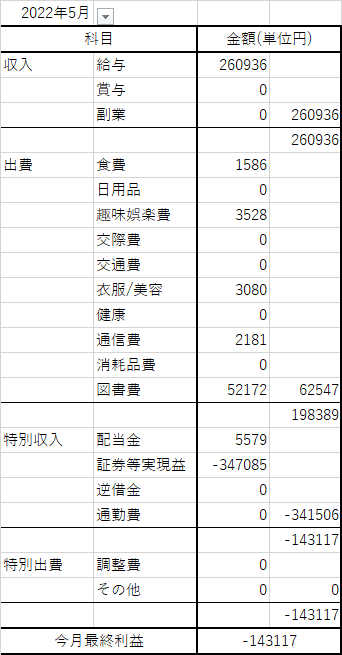 結果として月収支では14万円の赤字で、去年の7月に毎月の支出を一括計上(36万円)した時以来。
