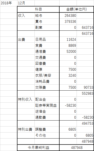 12月の損益計算書はこんな感じでした。今月も収入>収支で着々と資産が増えています。